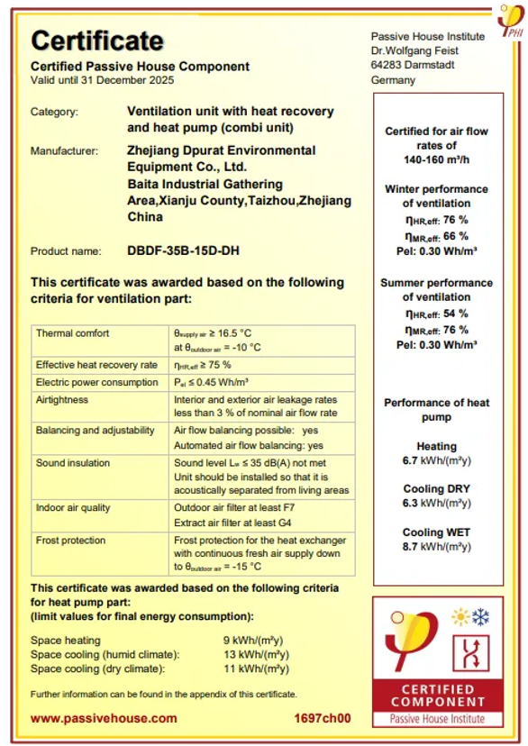 环控一体机获得全球公认最严苛的建筑能效评价体系---德国PHI认证,同时获得康居产品认证。